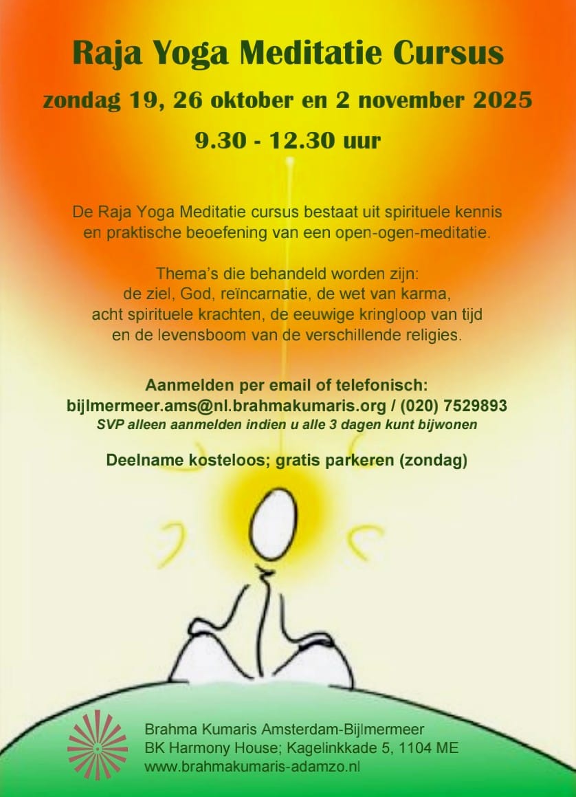 The Brahma Kumaris World Spiritual University is an international NGO working in over 140 countries, dedicated to teaching meditation, self-transformation, and values-based living. At the heart of its teachings is Raja Yoga meditation, an ancient practice of spiritual wisdom adapted for modern life. In the Netherlands, the Brahma Kumaris is registered with the Chamber of Commerce as a Foundation and has been a Public Benefit Organization (ANBI) since 2008. They have been serving communities for 44 years, with centres in Amsterdam, The Hague, Rotterdam, and other cities. All programs and courses are offered free of charge, as a contribution to personal and collective well-being. www.brahmakumaris.nl