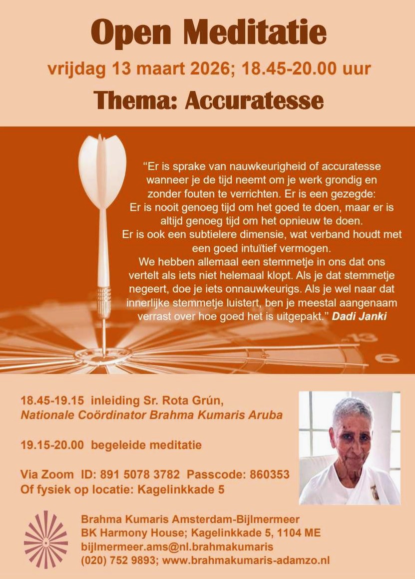 The Brahma Kumaris World Spiritual University is an international NGO working in over 140 countries, dedicated to teaching meditation, self-transformation, and values-based living. At the heart of its teachings is Raja Yoga meditation, an ancient practice of spiritual wisdom adapted for modern life. In the Netherlands, the Brahma Kumaris is registered with the Chamber of Commerce as a Foundation and has been a Public Benefit Organization (ANBI) since 2008. They have been serving communities for 44 years, with centres in Amsterdam, The Hague, Rotterdam, and other cities. All programs and courses are offered free of charge, as a contribution to personal and collective well-being. www.brahmakumaris.nl